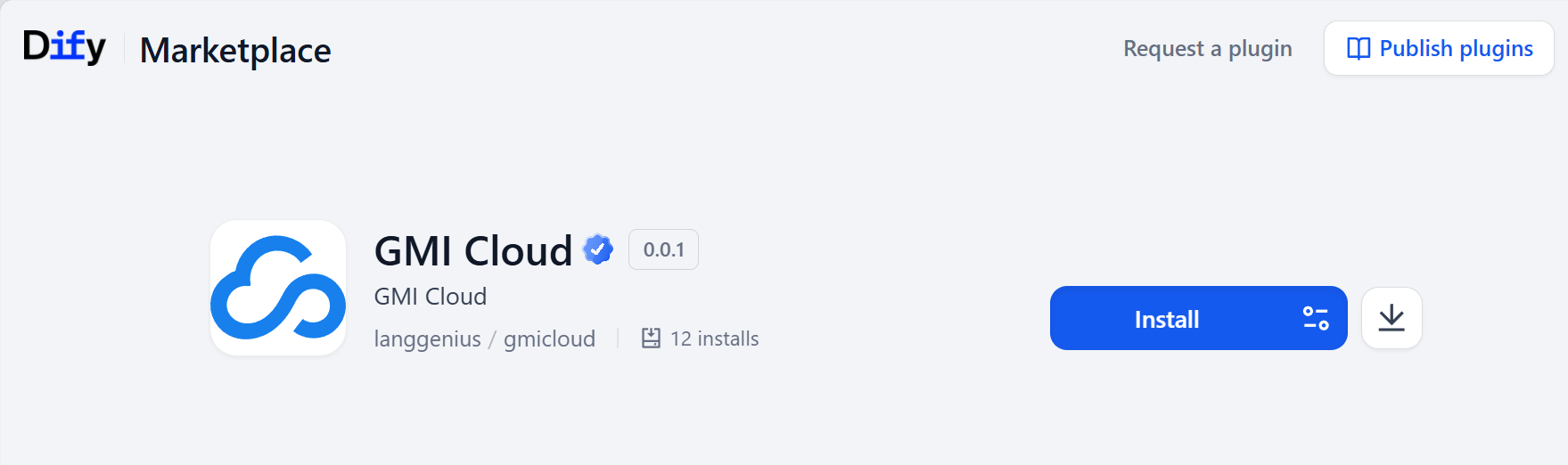 Now let’s get to Dify. Go to the Dify plugin marketplace, located at: Plugins - Dify. Search and install the GMI Cloud plugin.